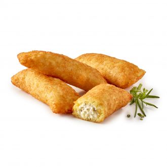 Hergestellt aus Kartoffelraspeln und einer herzhaften Füllung aus Frischkäse, Sauerrahm und Kräutern. In hochwertigem Rapsöl vorgebacken. Mit 25 % Füllung im Knuspermantel.