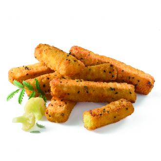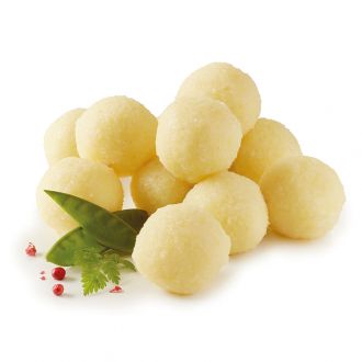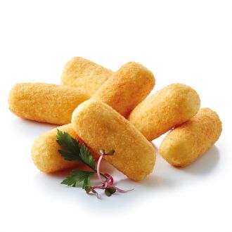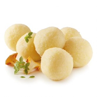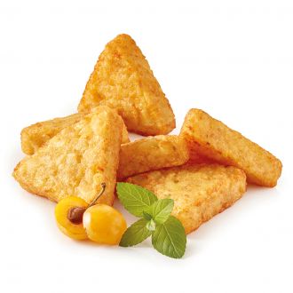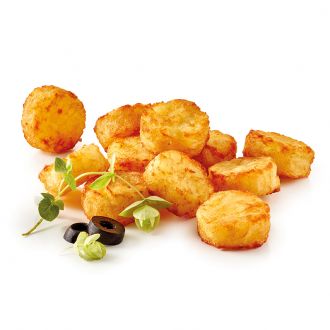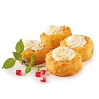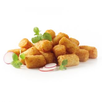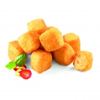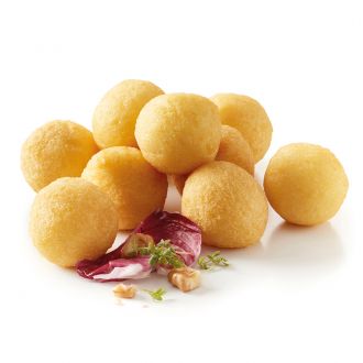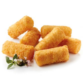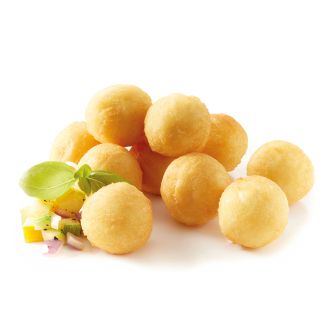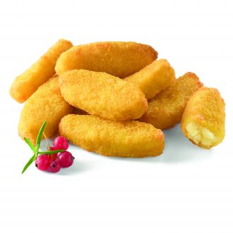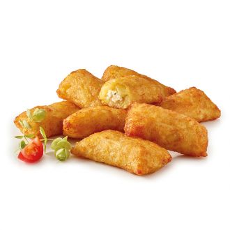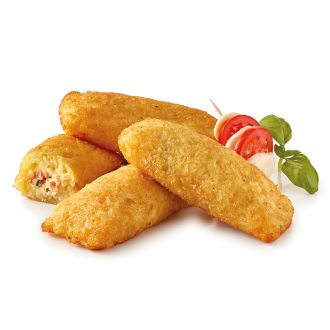 Hergestellt aus Kartoffelraspeln und einer italienischen Füllung aus Frischkäse, Sauerrahm, Mozzarella und Tomate. In hochwertigem Rapsöl vorgebacken. Mit 25 % Füllung im Knuspermantel.