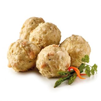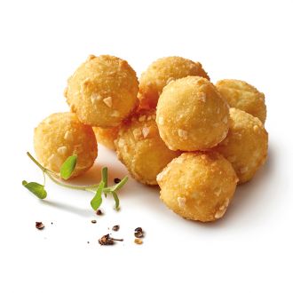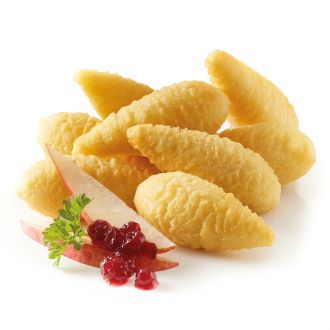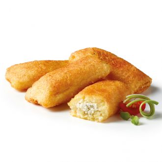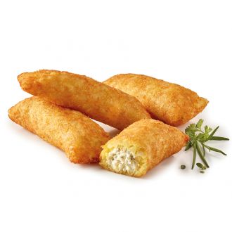 Hergestellt aus Kartoffelraspeln und einer herzhaften Füllung aus Frischkäse, Sauerrahm und Kräutern. In hochwertigem Rapsöl vorgebacken. Mit 25 % Füllung im Knuspermantel.