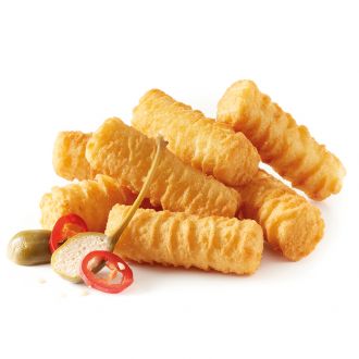 Crispy Rösti-Stäbchen im rustikalen Handmade-Style. Hergestellt aus frischen Kartoffelraspeln mit buntem Pfeffer und einer leichten Zwiebelnote. Perfekt einsetzbar als Snackartikel oder als moderne Beilage.