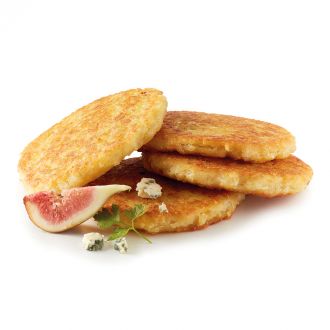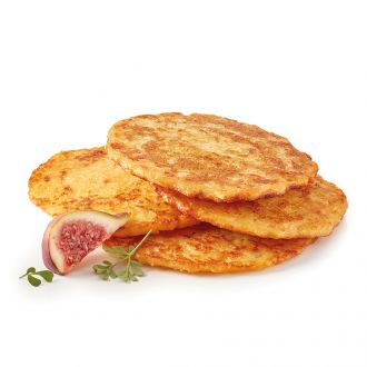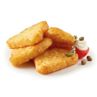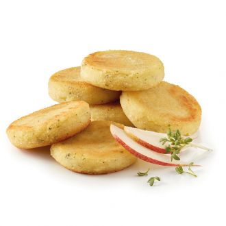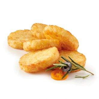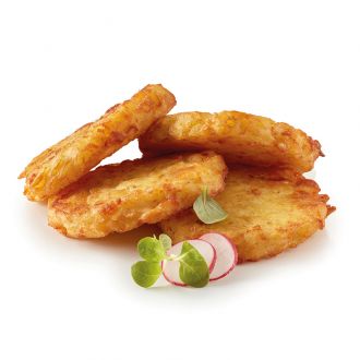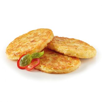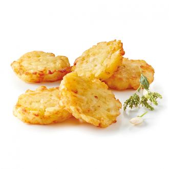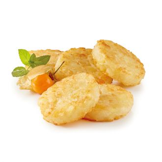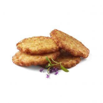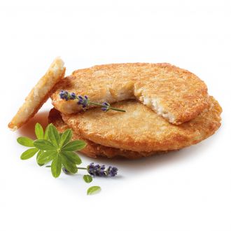 Rösti wie hausgemacht. Aus frischen grob geraspelten Qualitätskartoffeln, rustikal ausgeformt und in ungehärtetem, 100 % pflanzlichem Fett vorgebacken.