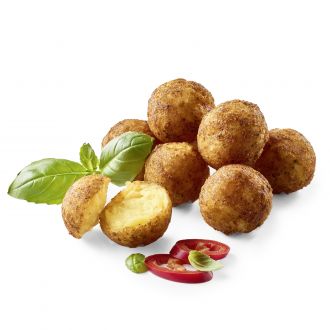 Hergestellt aus Kartoffelraspeln und einer italienischen Füllung aus Frischkäse, Sauerrahm, Mozzarella und Tomate. In hochwertigem Rapsöl vorgebacken. Mit 25 % Füllung im Knuspermantel.