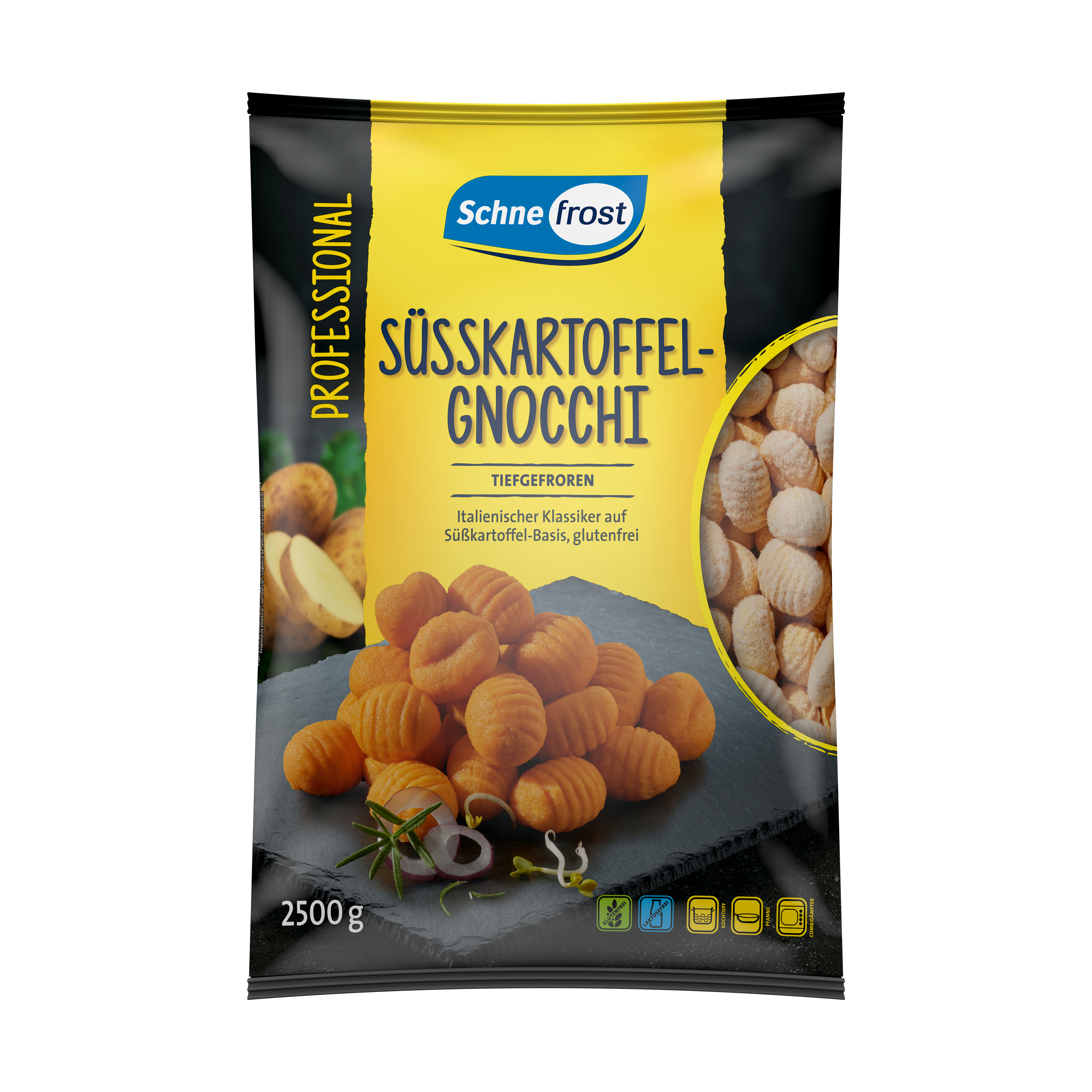 Süßkartoffelpüree 50 %, Karottenpüree 20 %, Kartoffelflocken, modifizierte Stärke, Kartoffelstärke, Sonnenblumenöl, Verdickungsmittel (Methylcellulose. Guarkernmehl, Xanthan), Speisesalz, HÜHNEREIWEIßPULVER, Stabilisator Mono- und Diglyceride von Speisefettsäuren, Gewürze.